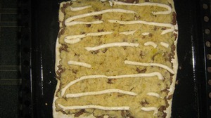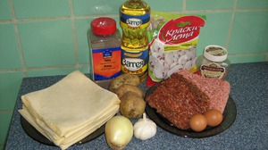 Противень смазываем растительным маслом и выкладываем тонко раскатанное тесто. Сверху 1-й слой начинки - фарш с чесночком.