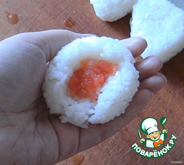 У меня начинкой служила малосольная семга мелко порезанная, но можно брать и жареную или угря, креветки, крабы, икру, все что угодно, кладут туда еще умэбоси (такая себе маринованная солено-кислая слива)