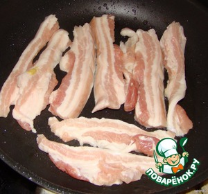Пока сковорода не остыла, обжариваем на ней нарезанную пластиками грудинку