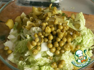 Режем соленые огурцы. Добавляем горошек
