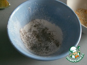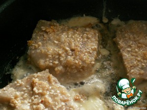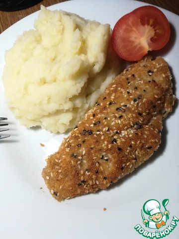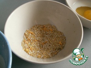 • Обвалять филе в смеси с мукой, затем обмакнуть в яичную смесь и обвалять с кунжуте с сухарями (лучше посыпать).