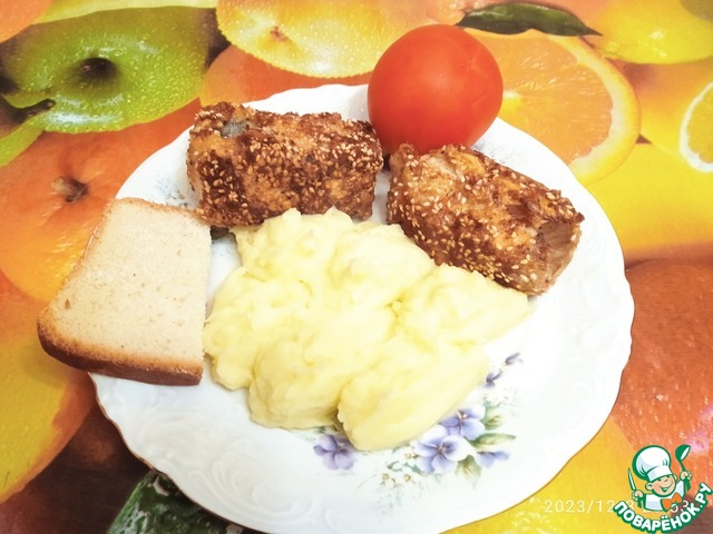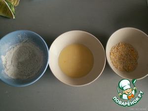 Обвалять филе в смеси с мукой, затем обмакнуть в яичную смесь и обвалять с кунжуте с сухарями (лучше посыпать).