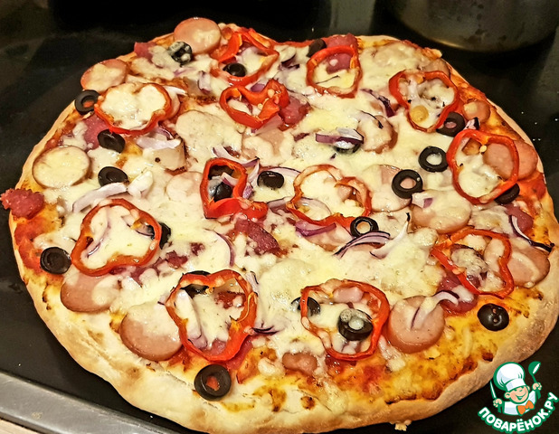 после чего тесто равномерно разлить по противню, смазанному жиром, и поставить в духовку на 5—7 минут до образования светло-золотистой корочки. Затем тесто вынуть, густо смазать его кетчупом. посыпать тертым сыром и равномерно выложить на него мелко нарезанную колбасу, лук нарезанный кольцами и маслины.