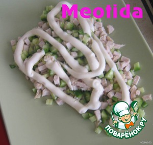 Выкладываем на тарелку курино-огуречный слой, промазываем заправкой