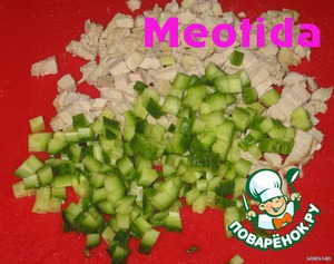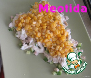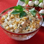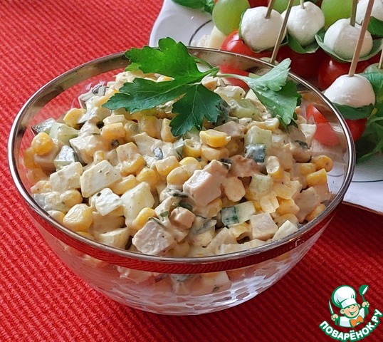 Не зря говорят: "Муж и жена - одна сатана".. вот так и мы с мужем.. видимо, смотрим на вещи одинаково.. изначально салат делала в виде подснежника. и муж, зайдя на кухню в процессе приготовления, сразу сказал: "Похож на подснежник"... а вот сестра с племянницей называли салат и "Сердечком", и чем угодно.. но только не цветочком.. и подснежником... вот я и долго не решалась Вам показать его.. но сам салат очень вкусный.. нежный и сочный.. легкий и весенний.. поэтому все-таки предлагаю его на Ваш строгий суд.. Итак: немного свежего огурчика.. куриной грудки.. вареных яиц.. кукурузы..