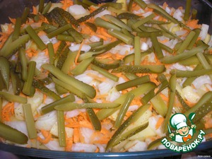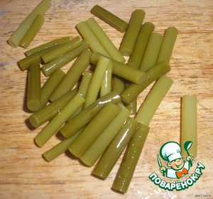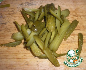 Огурцы режем соломкой. У меня были корнишоны. Можно взять обычный маринованный огурец - 1 шт.