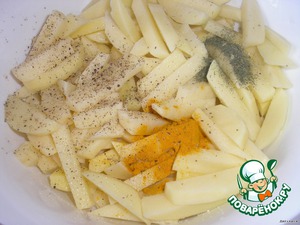 Выкладываем в большую миску. Добавляем соль, куркуму, зелень, черный перец. Перемешиваем.