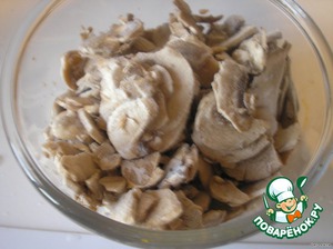 Шампиньоны у меня были мороженные, нарезанные пластинами. Примерно 1,5 стакана. Надо ориентироваться по форме, в который будете готовить.