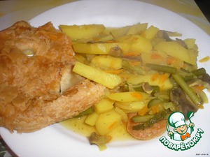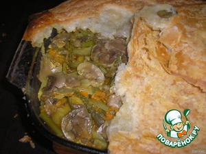 Опять я решила сделать овощи под крышкой из слоеного теста. Очень мне понравился мой предыдущий эксперимент "Овощной ларец". Да и судя по отзывам, поварята довольны :-) В этот раз картошка, грибочки, соленые огурцы и черемша. Вкус обалденный!!! И все это в соусе :-) И тесто пропитано ароматом овощей... На конкурс "Постимся с Moulinex".