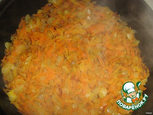 Лук режем мелко, морковь трём на крупной тёрке, всё это вместе обжариваем на подсолнечном масле