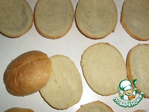 Булочки разрезаем вдоль пополам и у каждой вынимаем мякиш из обоих половинок