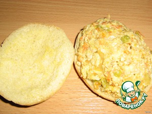 Взять нижнюю половинку булочки и начинить её полученной смесью с горкой, потом накрыть ёё верхней половинкой. Получается пирожок с начинкой.