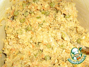 Всё соединяем: жаренные морковь с луком, фарш, сухарики, сыр, горошек зелёный, выдавливаем в эту смесь чеснок, добавляем майонез, сметанку (хорошо бы зелень, но у меня не было на тот момент)