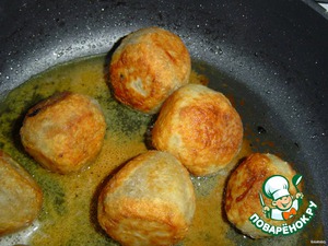 Из приготовленной картофельной массы сформуйте лепешки, в центр каждой положите немного фарша, края соедините, придавая изделиям форму шарика.