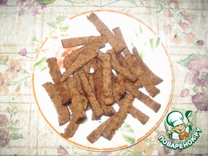 Нарезать хлеб соломкой и поджарить как гренки. Посыпать любимыми приправами. Я посыпала молотым сухим чесноком.