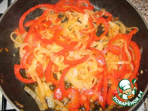 Нарезать перец длинными кусочками, добавить к луку и продолжать жарить. Посолить по вкусу.