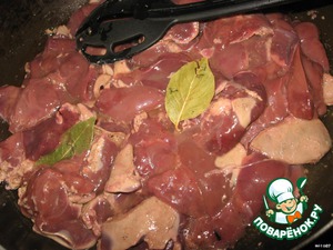Очистить от пленок и порезать на 4 части. Посолить, посыпать черным перцем, добавить лавровый лист. Оставит на время. |