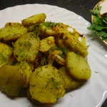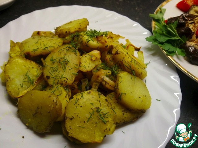 Картофель почистить, порезать кружочками, посолить и добавить специи - например сушеные укроп и петрушку