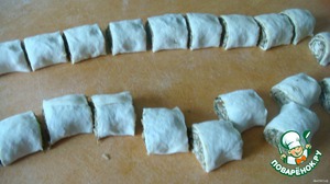 Нарезать рулет,брусочками толщиной 4-5см,(чтобы получились розочки, надо скрепить один край)
