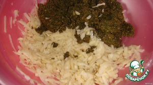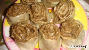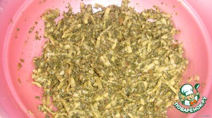 Готовим начинку:Крапиву мелкую,молодую почистить,помыть хорошо и измельчить,лук порезать мелко и обжарить на масле до золотистого цвета,измельчённые орехи залить кипятком и оставить для набухания,всё это добавляем в крапиву и перемешиваем.