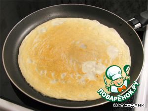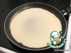Хорошо разогреть сковороду средней величины, смазать ее маслом, налить разливательной ложкой тесто на сковороду, быстро повертывая ее, чтобы тесто разлилось по всей сковороде ровным и тонким слоем. Блинчики, подрумянившиеся, снимать со сковороды, складывать стопкой на доске или блюде.
