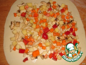 Готовим начинку. Все овощи порезать мелкими кубиками. Посолить и обильно поперчить, добавить растительное масло и перемешать.