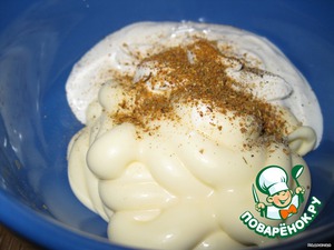 Готовим соус: смешиваем сметану, майонез и молоко со специями.