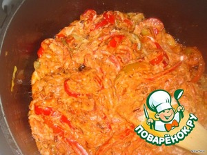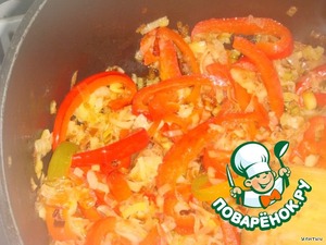 И когда лук становится золотистым добавляем к нему перец. Тушим их минут 7-8 вместе.