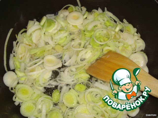 Теперь сам соус. Лук порей, белую его часть, режем кольцами.