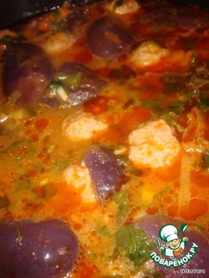 Заливаем водой. Баклажаны будут плавать, как поплавки :-D. Накрываем крышкой и даем им закипеть. Уменьшаем огонь и тушим на маленьком огне до готовности. Если остался фарш, можно скатать фрикадельки и отправить их туда же. В процессе приготовления пробуем юшку, солим по вкусу.