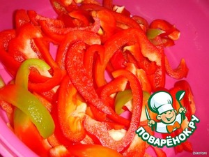 Пока жарится лук нарезаем соломкой болгарский перец.