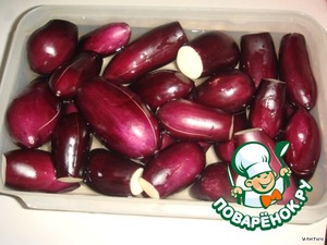 Моем, отрезаем хвостики, делаем надрез вдоль баклажана, осторожно, чтоб не прорезать насквозь и замачиваем в сильно соленой воде. Они должны полежать, обмякнуть, так, чтобы их можно было свободно раскрыть для фаршировки. Я даю им полежать в воде минут 30, а потом каждый отжимаю в руках, так, как мы отжимаем мочалку. Так несколько раз. Где-то в общем они у меня "плавают" час, полтора.