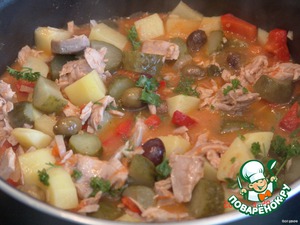 Добавляем мясо тунца, соленые огурцы, нарезанные толстыми колечками или полуколечками, нарубленную петрушку. Тушим до готовности. Под такое блюдо традиционно подается белое сухое вино.