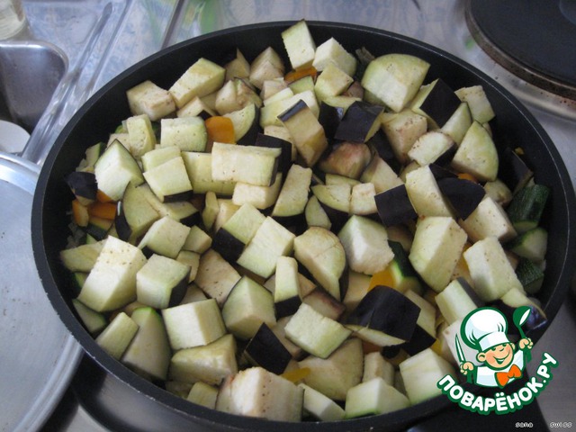 Добавляем салатные перцы, баклажаны, кабачки (все нарезаем крупными кубиками), добавляем соль, перец, майоран, тимьян и тушим, периодически помешивая, около 10-15 мин.