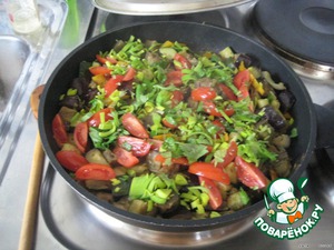 Добавляем нарезанные томаты, базилик и тушим еще 5-10 мин. периодически помешивая.