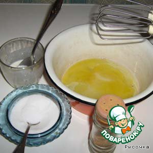 • Взбиваем яйца с солью, красным перцем и сливками. У меня не было сливок, я растворила 1 столовую ложку сухого молока в 1/4 стакана теплой воды.