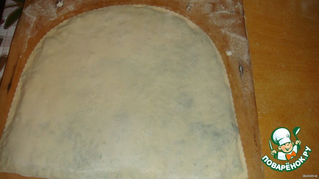 Раскатываем заранее приготовленный круг теста,в продолговатую форму(теста раскатать тонко)