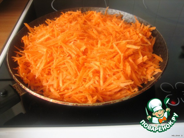 Далее выкладываем в глубокую сковородку с растительным маслом и тушим до полуготовности - в это время морковка очень сильно "садится" в объёме и уменьшается прямо на глазах.
