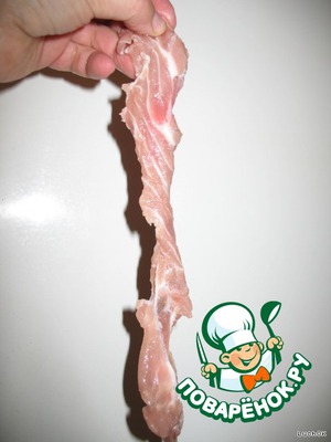 У меня были вот такие очень длинные кусочки свинины, поэтому я их разрезала на части