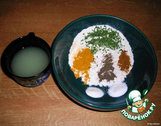 Для начала приготовьте тесто. Для этого смешайте вместе муку, соль, соду, зелень и специи.
