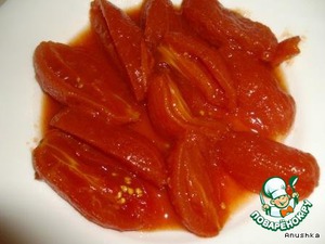 Помидоры достаем из банки (сок потом используем на соус) и режем пополам.