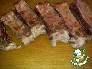 Нарезать мясные ребрышки (в идеале лучше целым куском, так сочнее), но мы любим, чтобы со всех сторон была корочка