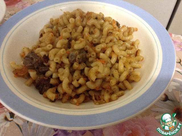 Перемешиваем, добавляем воды (если жидкости мало) и продолжаем томить под закрытой крышкой до готовности макарон. Она наступает где-то через 10 минут (в зависимости от самих макарон). Время от времени открывайте крышку и перемешивайте.