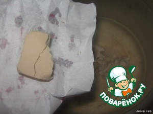 Приготовим тесто. Для этого, в тёплой воде, растворим дрожжи. У меня были свежие, но можно использовать и сухие - 1 пакет.