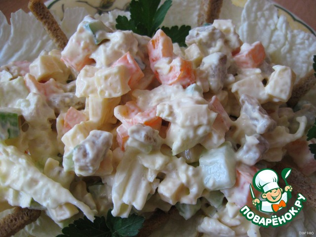 • Я соль и перец не добавляла, т. к. сухарики сделали это за меня. Сверху салат можно посыпать нарубленными грецкими орехами.