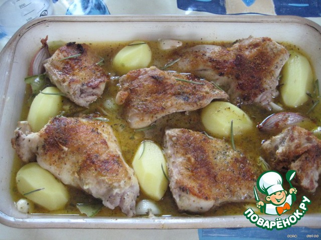 Добавить розмарин, картофель очищенный, бульон (чтоб покрыло на половину) и в разогретую духовку (170°C) на 1,5 часа.