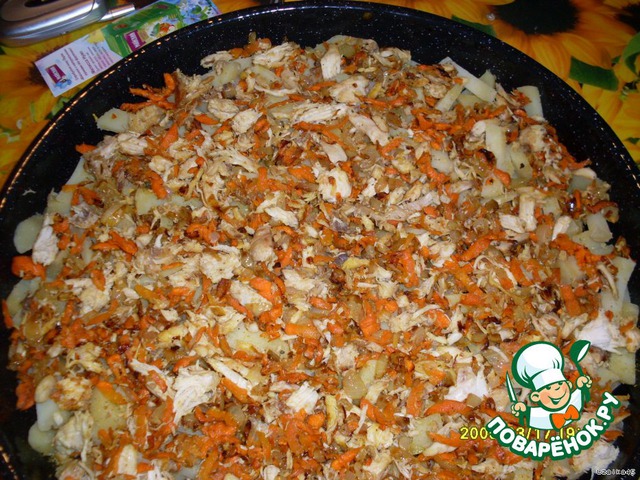 Отварное куриное филе порезать (как получится), морковь потереть на терке, лук порезать кубиками