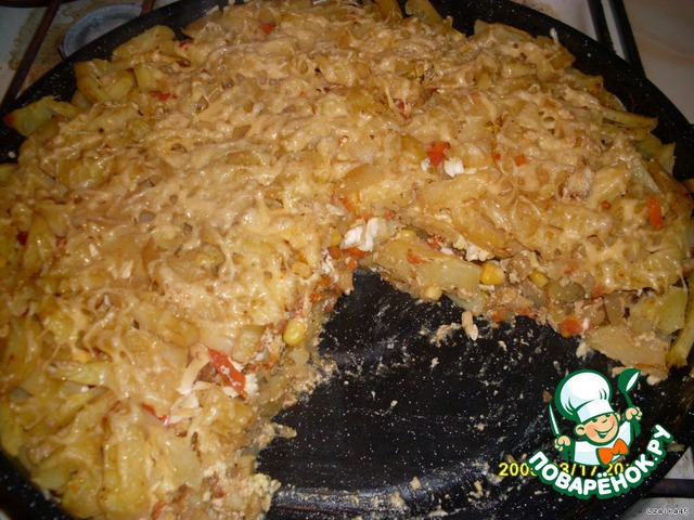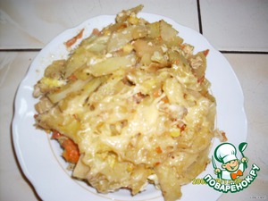 Опять слой картошки. Заливаем сметаной, смешанной с соевым соусом. Посыпаем тертым сыром и ставим в духовку. Запекаем до готовности картошки!
