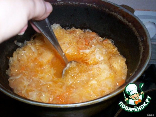Капусту нашинковать и добавить в казан. Налить воды, чтобы капуста слегка была прикрыта, посолить. Потушить минут 10-15 -