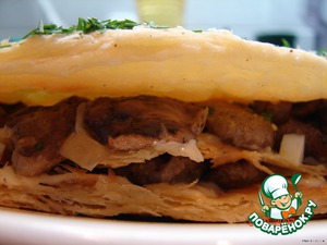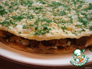 Смазываем каждый корж сыром и выкладываем тонким слоем грибы. Даeм пропитаться.